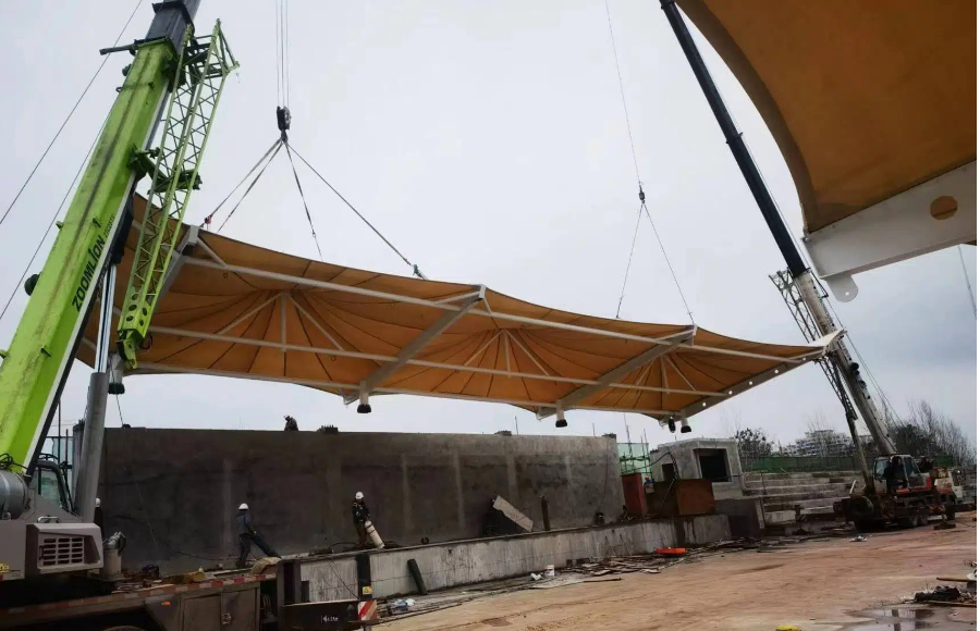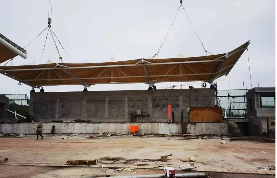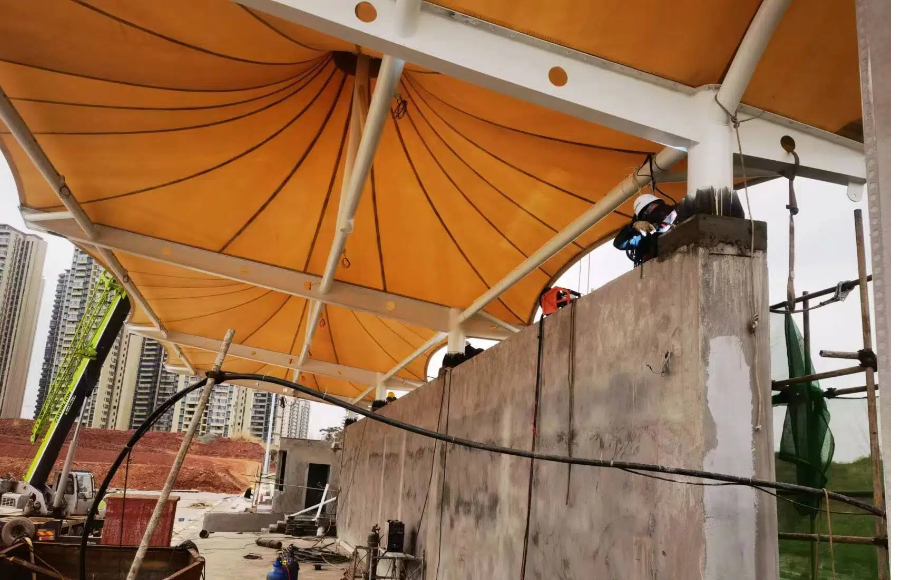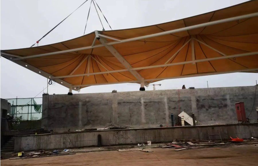 綿陽育才中學(xué)莫結(jié)果看臺(tái)工程正在施工中,看臺(tái)設(shè)計(jì)為單邊懸挑張拉結(jié)構(gòu),選用黃色膜材。